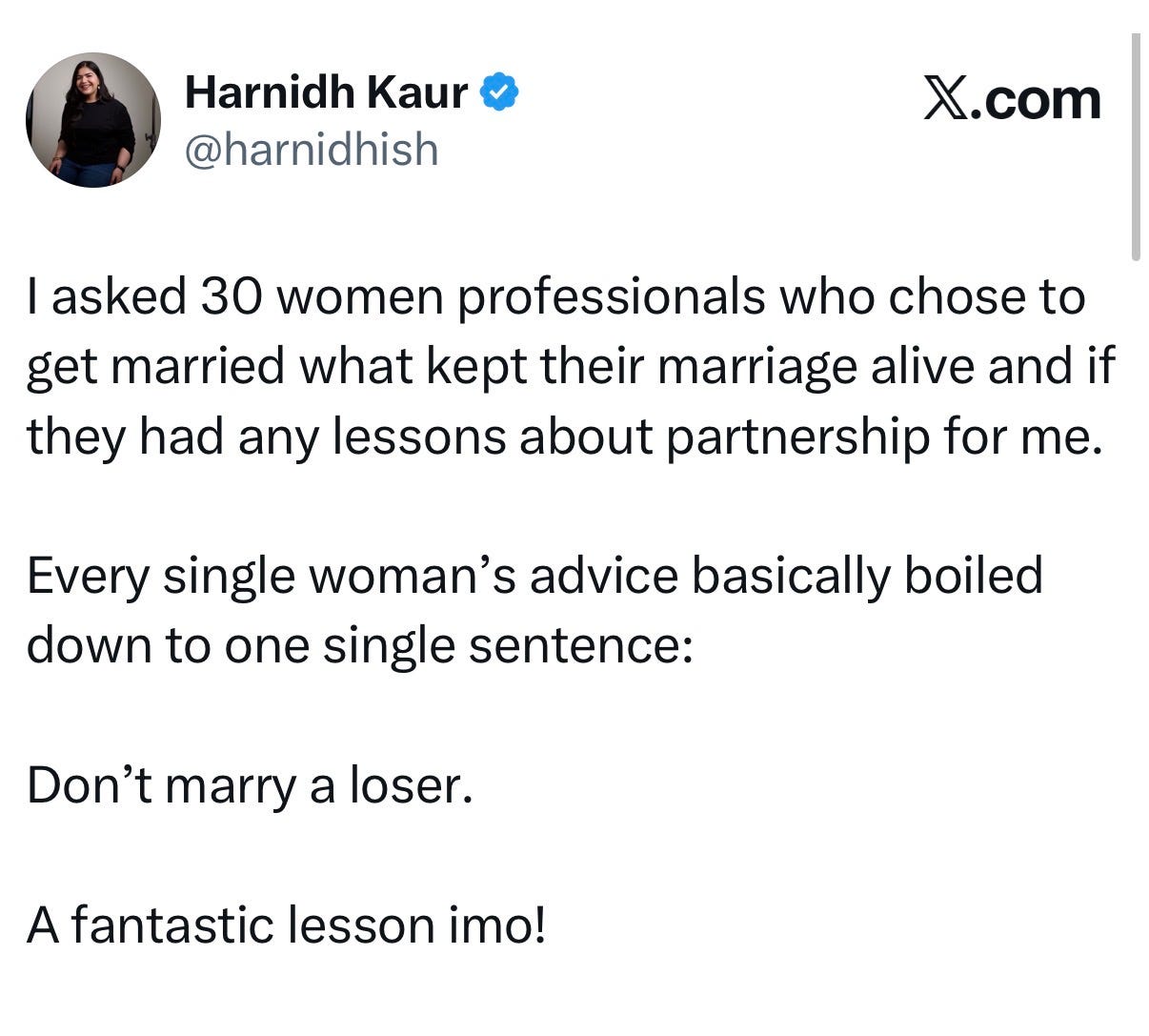 The ones who are genuinely happy (and there are some, more than I expected!) did not luck out. The framing of marital happiness as luck is one of the more damaging stories we tell women. The happy ones chose carefully. They paid attention to data points most people dismiss as too small to matter: how he talked about his exes, how he handled it when things didn’t go his way, how his energy changed when she succeeded, whether he could apologise without the apology becoming a second argument about her behaviour. They trusted their instincts even when the instincts were inconvenient, even when inconvenience arrived after three years of investment. They made a decision with their eyes open, and now they’re reaping the returns on a good early call.