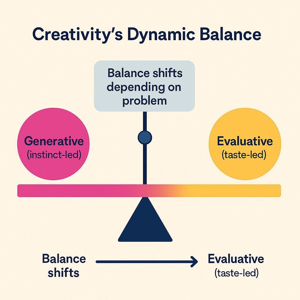 Some researchers talk about a “golden ratio” in creativity- not a fixed number, but a dynamic balance between generative (instinct-led) and evaluative (taste-led) phases. The balance shifts with the problem: ambiguous challenges need more instinct; constrained ones need more taste.