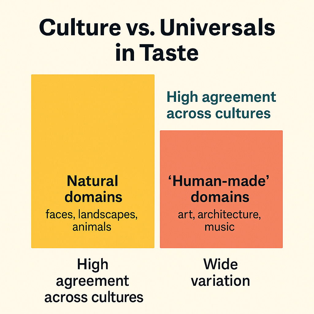 Large-scale cross-cultural research from 2024–2025 found something surprising: our agreement on beauty depends on the domain. When the subject is natural (faces, landscapes, animals), the overlap is huge. Across continents and cultures, people tend to agree on which landscapes are calming, which faces are attractive, which animals look “majestic.” But when the subject is human-made (paintings, buildings, music), agreement splinters. Here, taste fragments into local dialects, shaped by what your culture celebrates and what it teaches you to ignore.