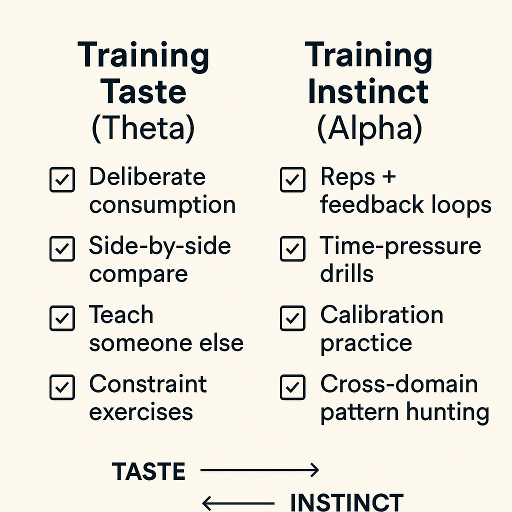 This is where taste and instinct need each other most. Taste, the slow, reflective mode, is what helps you recognise when you’re out of your lane, when your gut might be operating on incomplete or irrelevant patterns. And instinct, once trained in a domain, is what lets you actually move when the clock is ticking and the data is incomplete.