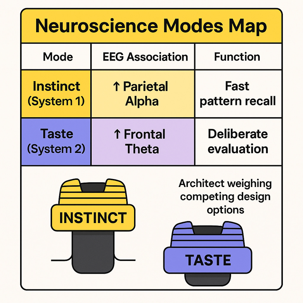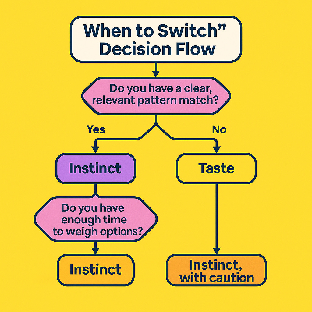 But here's what the research doesn't tell you: how to recognize which mode the moment demands. Some problems scream for instinct: a crisis unfolding, an opportunity that won't wait, a creative block that needs breaking. Others demand taste: a final design review, a make-or-break pitch, a strategy that has to work the first time. The real skill is learning to read the moment, both what's happening around you and what's happening inside your own head. When you feel paralyzed by options, that's instinct calling. When you feel rushed toward a mediocre solution, that's taste tapping its foot.