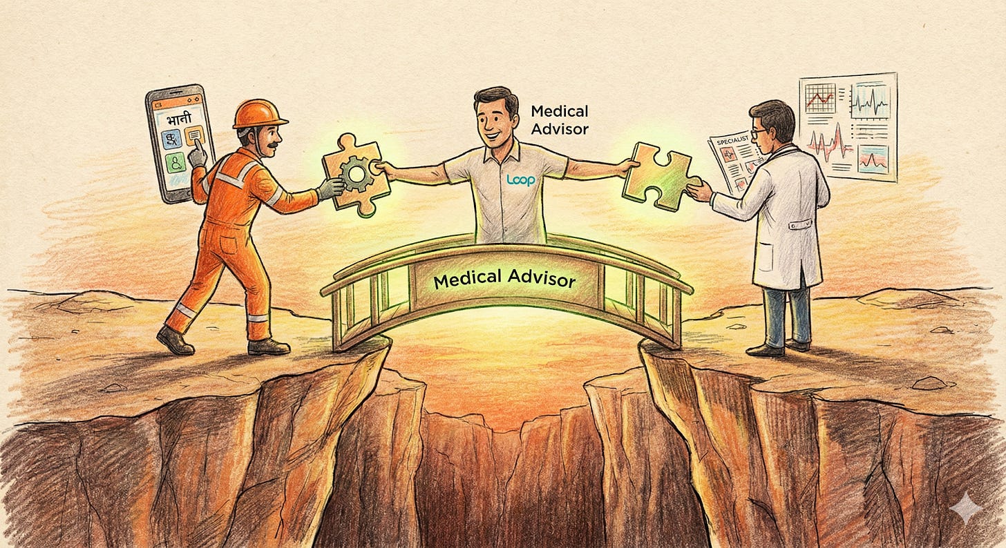 2:17 AM, somewhere in Loop Health’s distributed medical operations. Dr. Priyadarshani’s night shift team is three hours into their watch when the message comes through. A Zepto employee in Gurgaon, awake after his shift, worried about his father’s chest pain. His father is in Patna, 1,100 kilometers away, and doesn’t speak English.