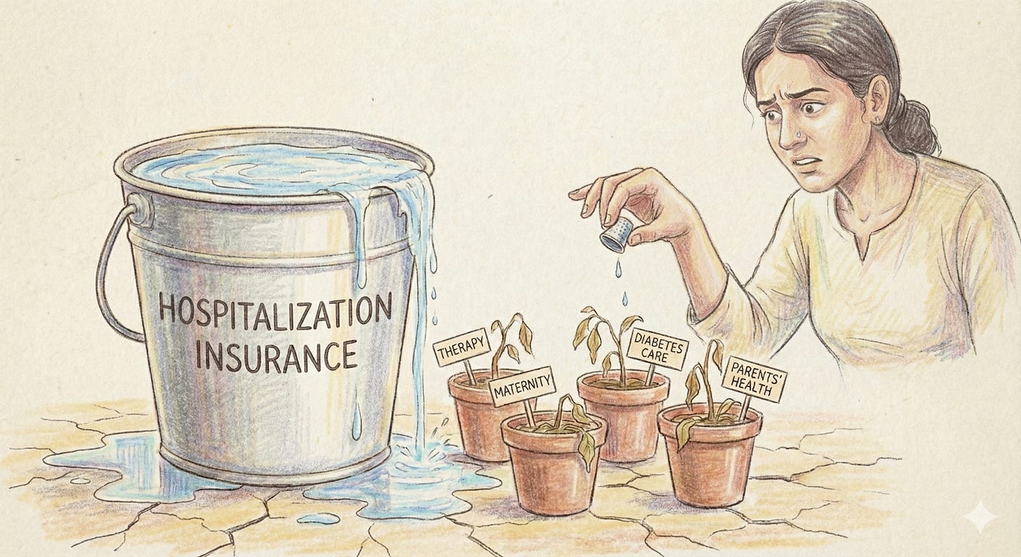 The numbers tell the story Ryan’s too kind to spell out. This is corporate India’s greatest magic trick. Companies spend ₹20-30K per employee annually on benefits. Only 10% of employees will be hospitalized and get a meaningful benefit, potentially ₹2-5L depending on their sum insured. The other 90% of employees don’t realize any value. They end up spending ₹10-15K out of pocket on the care they actually need: therapy sessions at ₹2,000 each, quit halfway because they can’t afford more; maternity scans and supplements adding up to ₹50K that insurance won’t touch; diabetes monitoring that costs ₹1,000 monthly but isn’t “treatment” enough to claim.